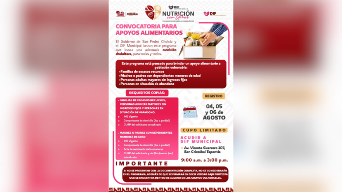 El Gobierno Municipal de San Pedro Cholula, encabezado por la Presidenta Tonantzin Fernández, informa que se amplía el periodo de registro para el programa de apoyos alimentarios “Nutrición Con Amor”, con el objetivo de garantizar mayor cobertura y beneficiar a un mayor número de familias en situación de vulnerabilidad.
