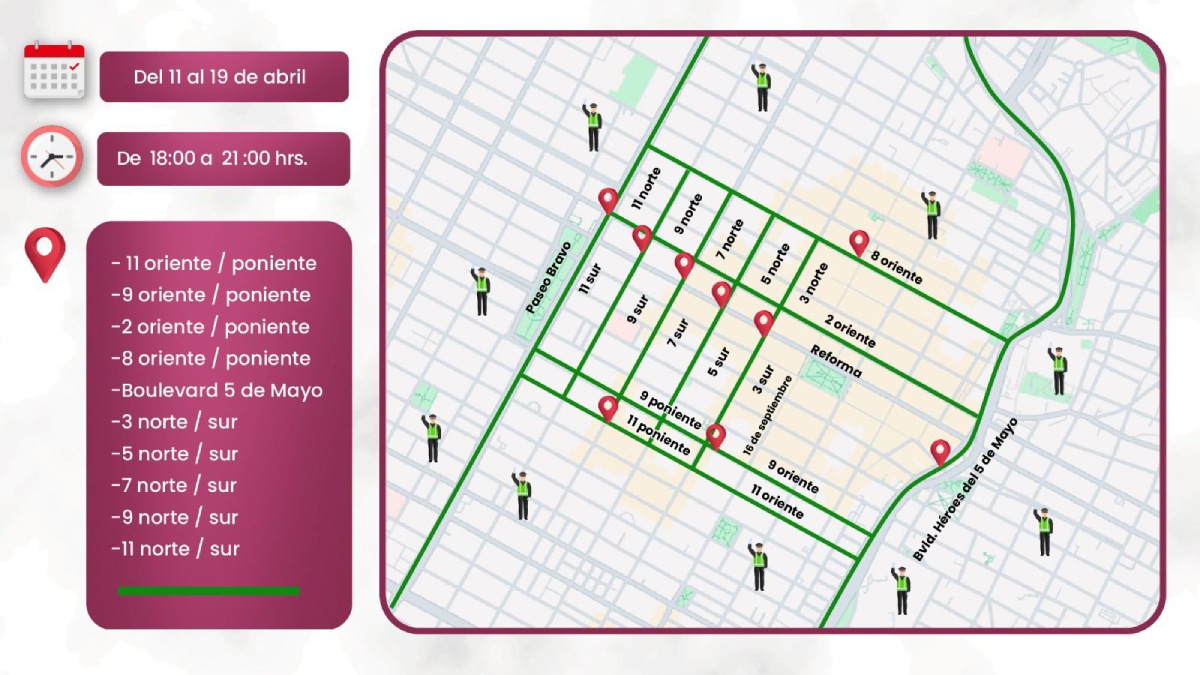 Los cierres viales estarán vigentes del 11 al 19 de abril en un horario de 18:00 a 21:00 horas, con el objetivo de facilitar la movilidad durante el desarrollo del evento.