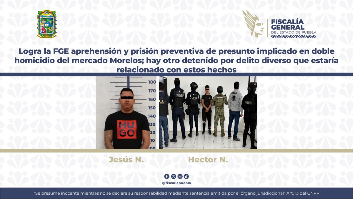 La Fiscalía General del Estado de Puebla, con apoyo de las Secretarías de Marina (SEMAR) y Seguridad Ciudadana de Puebla (SSC), cumplimentó una orden de aprehensión en contra de Héctor N., quien se encuentra con prisión preventiva tras presuntamente estar implicado en el homicidio de dos personas cuyos cuerpos fueron localizados en el centro de la ciudad de Puebla; además, hay otro detenido por un delito diverso, el mismo que también estaría relacionado con estos hechos.