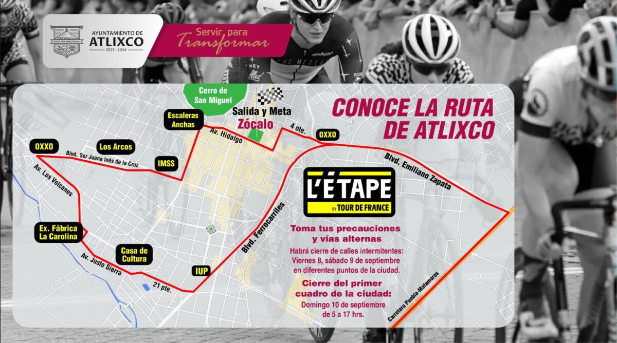 Finalmente, el zócalo de Atlixco será el punto de salida; así como la meta de la L’Étape Puebla by Tour de France 2023, iniciando a las 06:30 horas y terminando aproximadamente a las 4:00 de la tarde, siguiendo esta ruta en la ciudad, avenida Libertad, Zócalo, avenida Independencia, 3 poniente, 11 sur, avenida Manuel Ávila Camacho, boulevard Sor Juana Inés de la Cruz, Volcanes, avenida del Trabajo, Justo Sierra, 21 poniente de la Colonia Guadalupe, boulevard Ferrocarriles y Emiliano Zapata; hasta llegar a la carretera federal; se recomienda tomar vías alternas para evitar cualquier contratiempo.