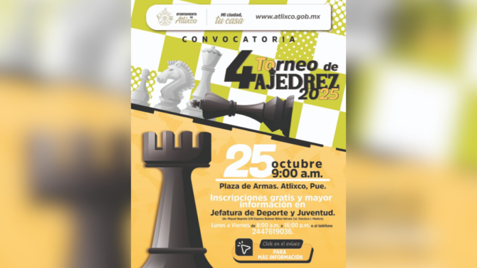La presidenta de Atlixco, Ariadna Ayala, convoca a niñas, niños, jóvenes y adultos a participar en el Cuarto Torneo de Ajedrez 2025, que se realizará el sábado 25 de octubre a las 9:00 horas en la Plaza de Armas.