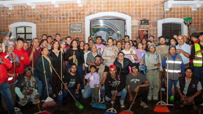 La presidenta de Atlixco, Ariadna Ayala, vecinos de varias colonias, comerciantes, prestadores de servicios y servidores públicos lavaron el zócalo.