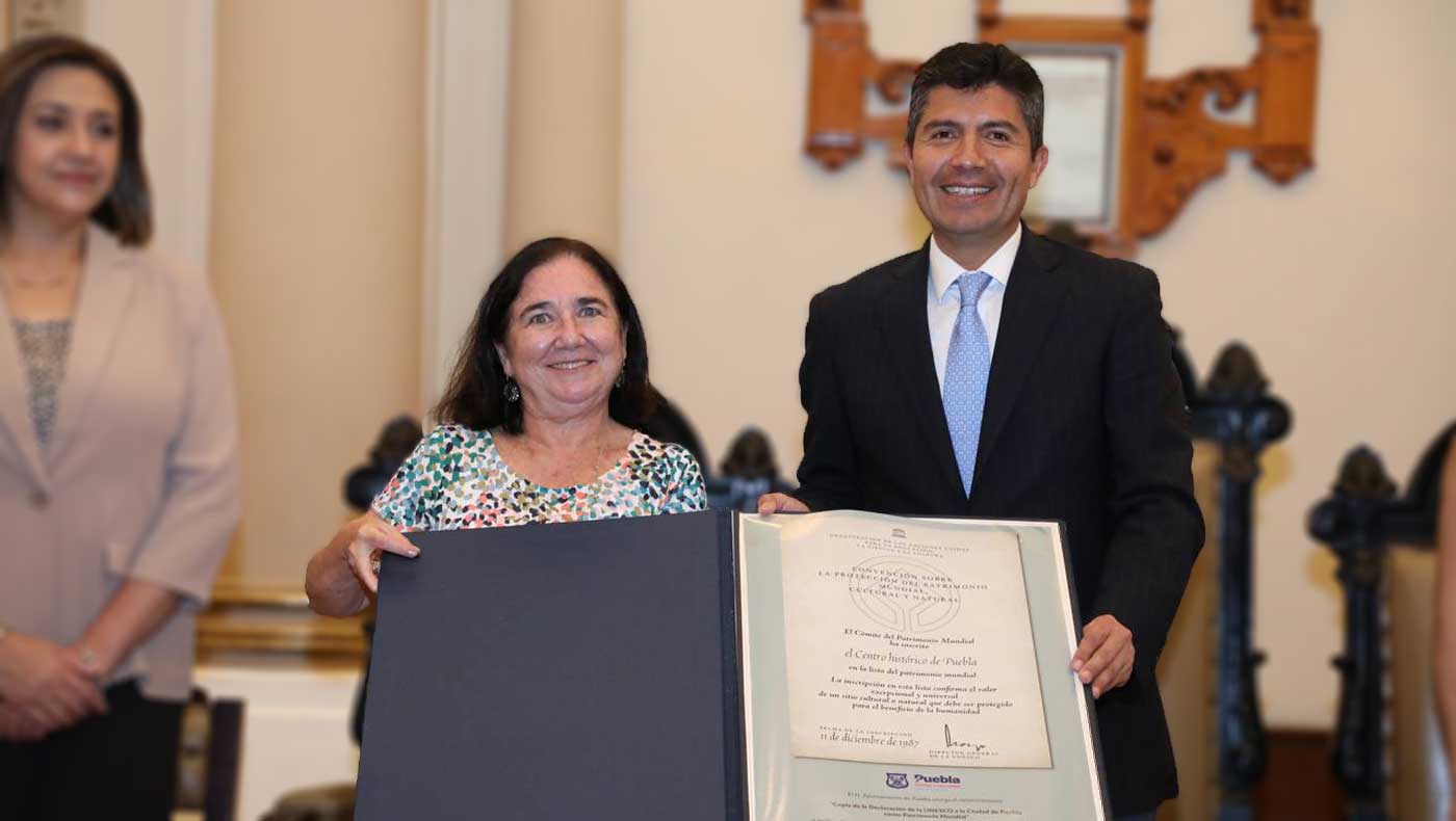 En el marco del 492 Aniversario de la Ciudad, la capital angelopolitana recibió la visita de Esther Cruces Blanco, Directora General del Archivo de Indias de Sevilla, España a quien el Presidente Municipal Eduardo Rivera Pérez entregó el reconocimiento “Puebla Patrimonio Cultural de la Humanidad”.