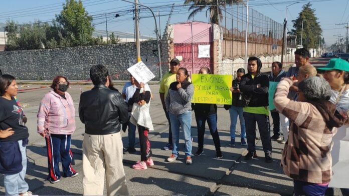 Alrededor de las 08:00 horas, un grupo de padres se colocó en la vialidad con pancartas y carteles, exigiendo la rehabilitación del techo del inmueble, el cual presenta escurrimientos y daños que ponen en riesgo la seguridad de los estudiantes.