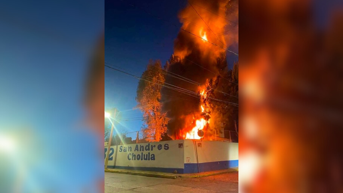 #Seguridad 🚒 Un incendio consumió esta noche un árbol en la Secundaria Técnica número 32 de #SanAndrésCholula, generando riesgo para construcciones aledañas. pic.twitter.com/VoUwzAR66Y