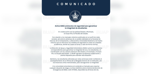 Ante amenazas emitidas por un supuesto alumno de la Facultad de Computación de la BUAP hacia compañeros y docentes, autoridades universitarias y estatales reforzaron la seguridad en la zona. En un comunicado oficial, la BUAP informó que se incrementaron las medidas de seguridad con apoyo de la Secretaría de Seguridad Pública del estado (SSP), la … Sigue leyendo BUAP refuerza seguridad tras amenazas de alumno en redes sociales
