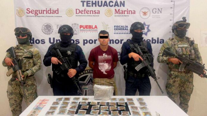 Derivado de la implementación de patrullajes focalizados, la Secretaría de Seguridad Pública (SSP), con apoyo de la Secretaría de Marina (SEMAR), detuvo a un hombre que pretendía distribuir envoltorios con posible marihuana en Tehuacán.