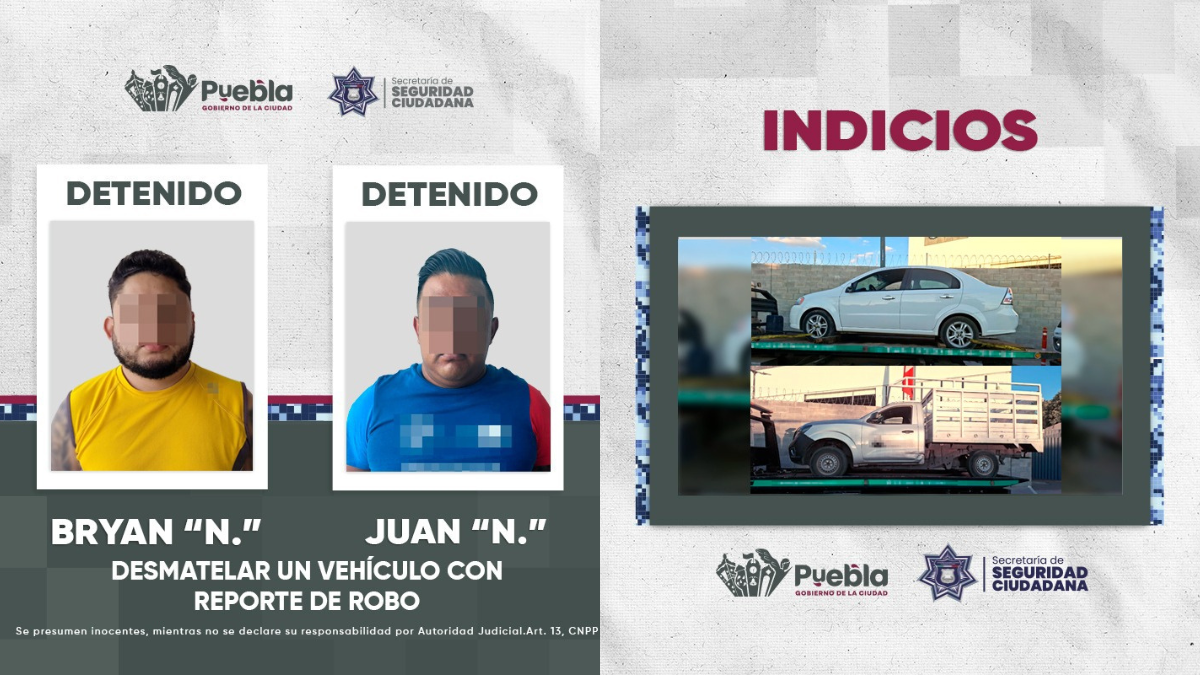 Elementos de la Policía de la Ciudad detuvieron a dos hombres, quienes fueron sorprendidos cometiendo hechos con apariencia del delito de desmantelar un vehículo con reporte de robo.