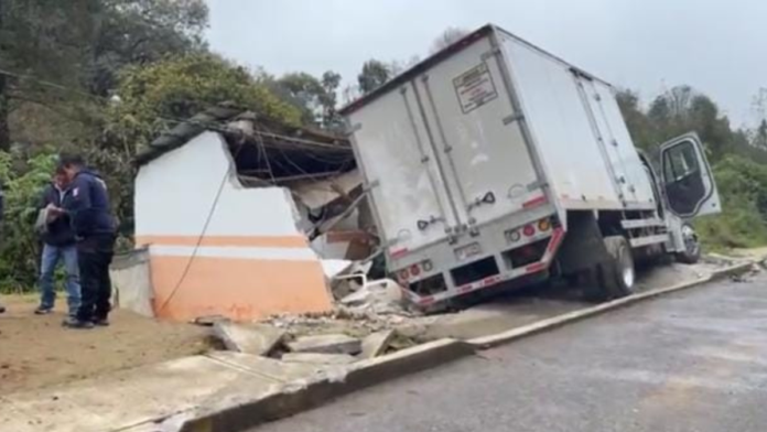 De acuerdo con los reportes, la unidad, cargada con mercancía, perdió los frenos al descender por una pendiente y no pudo evitar colisionar contra la vivienda ubicada frente al camino, la cual quedó prácticamente destruida, quedando parcialmente en su interior.
