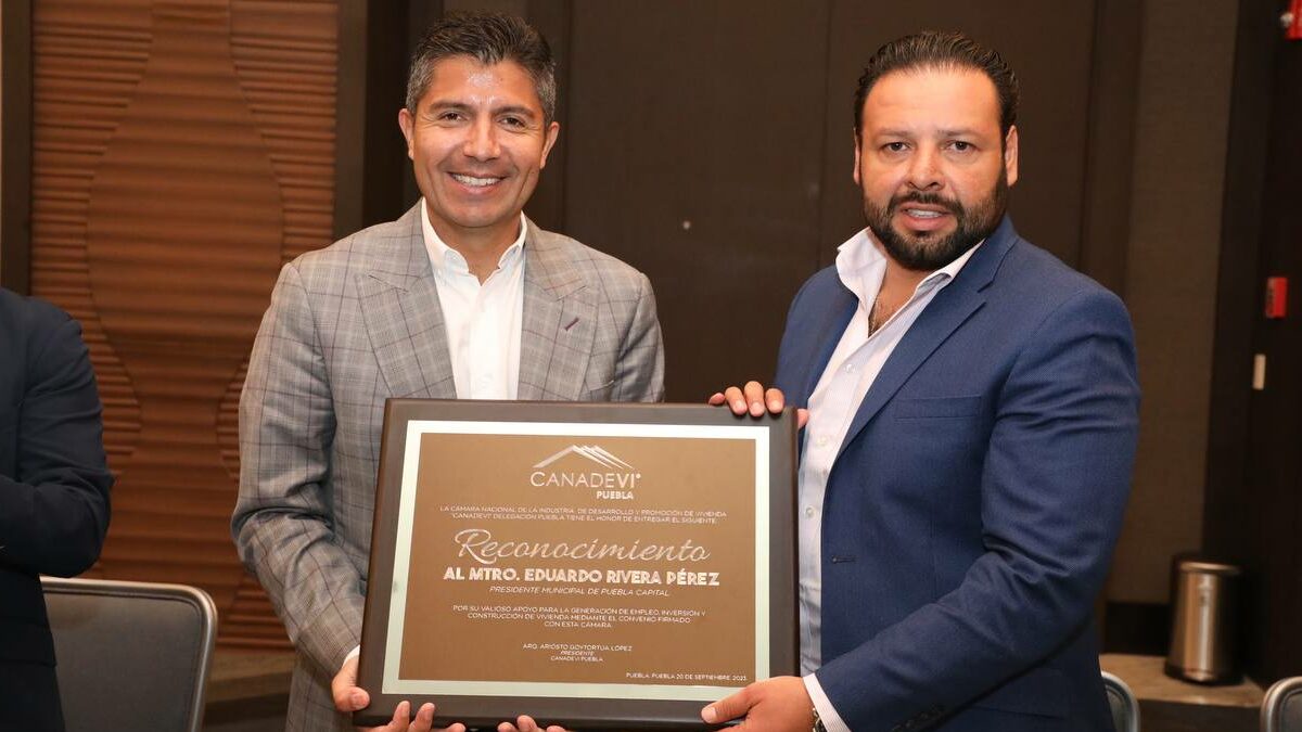 Como un reconocimiento al destacado compromiso y liderazgo en la promoción del desarrollo de nuevos hogares, Eduardo Rivera Pérez, Presidente Municipal de Puebla, recibió un reconocimiento de parte de socios de la Cámara Nacional de Desarrolladores de la Vivienda (CANADEVI).