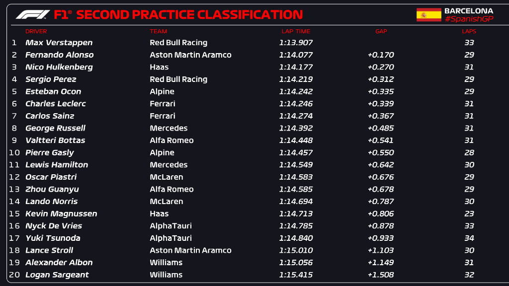 El piloto mexicano Sergio Pérez finalizó los segundos libres del Gran Premio de España en la cuarta posición, a tan solo .312 milésimas de su compañero de equipo Max Verstappen, todo lo contrario, a lo sucedido en la primera práctica, donde concluyó segundo a .768 milésimas del neerlandés.