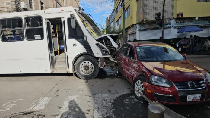 El accidente ocurrió en la intersección de la 14 Poniente y 9 Norte, donde la unidad 13 de la ruta M17 impactó contra un automóvil particular. De acuerdo con testigos, el percance se originó cuando el conductor del transporte público, presuntamente a exceso de velocidad, intentó ganarle el paso al vehículo, provocando el choque frontal.