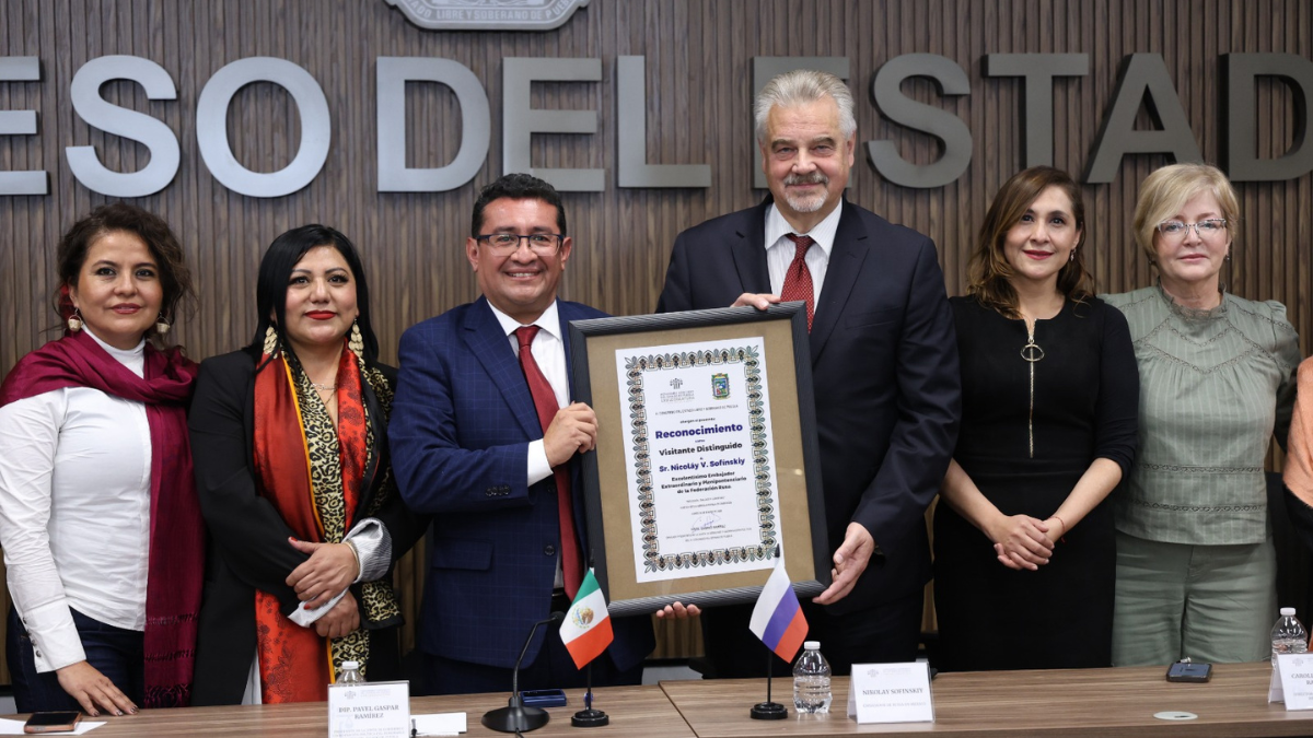 Con motivo de la conmemoración de los 135 años de relación diplomática ininterrumpida entre México y Rusia, el diputado Pável Gaspar Ramírez, presidente de la Junta de Gobierno y Coordinación Política del Congreso del Estado, recibió al embajador de la Federación de Rusia en México, Nikolay Sofinskiy, en un acto que refrenda los lazos históricos de cooperación entre ambas naciones.