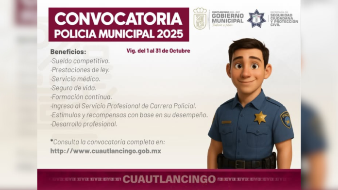 Con la finalidad de reforzar la seguridad en el municipio de Cuautlancingo y abonar a la tranquilidad de los ciudadanos, el Ayuntamiento lanzó la convocatoria para el reclutamiento de personal para que formen parte de la Secretaría de Seguridad Ciudadana y Protección Civil.