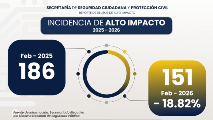 Entre los principales avances destaca la reducción de delitos de alto impacto, donde sobresale que, en la comparación de febrero de 2025 a febrero de 2026: