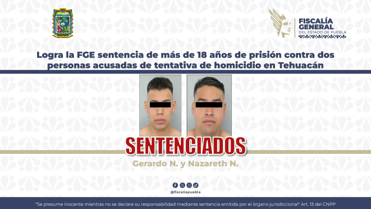 Como resultado de los argumentos presentados por la Fiscalía General del Estado de Puebla, se logró una sentencia de 18 años y 4 meses de prisión contra Gerardo N. y Nazareth N., acusados de homicidio calificado en grado de tentativa, ocurrido en Tehuacán, Puebla.