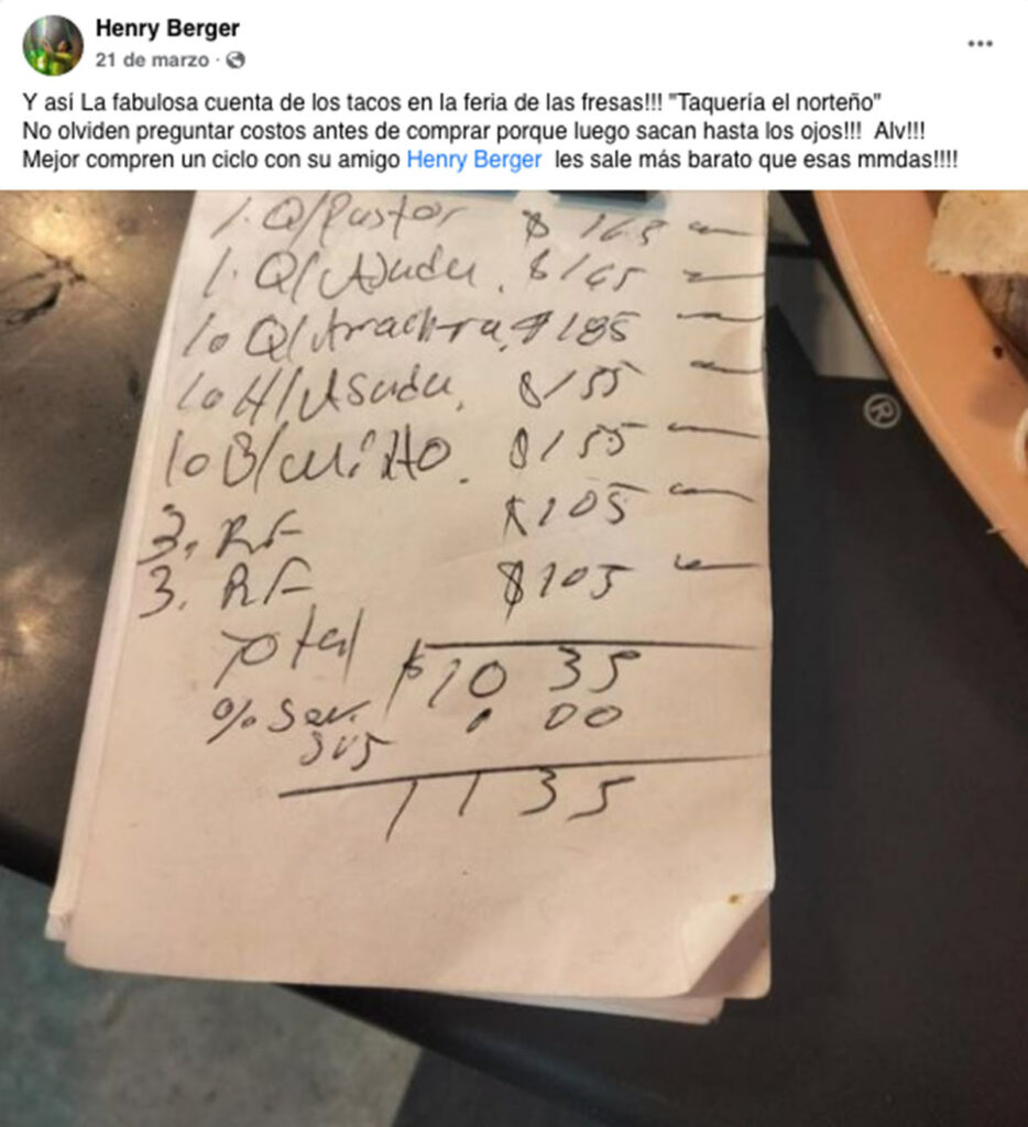 A través de Facebook, un joven identificado como Henry Berger, denunció que pagó una cuenta de mil 35 pesos por cinco tacos y dos refrescos.