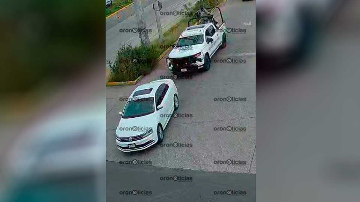 Fotografías en poder de Oro Noticias revelan que ese auto particular iba escoltado por una patrulla de la Guardia Nacional con el número 28098.