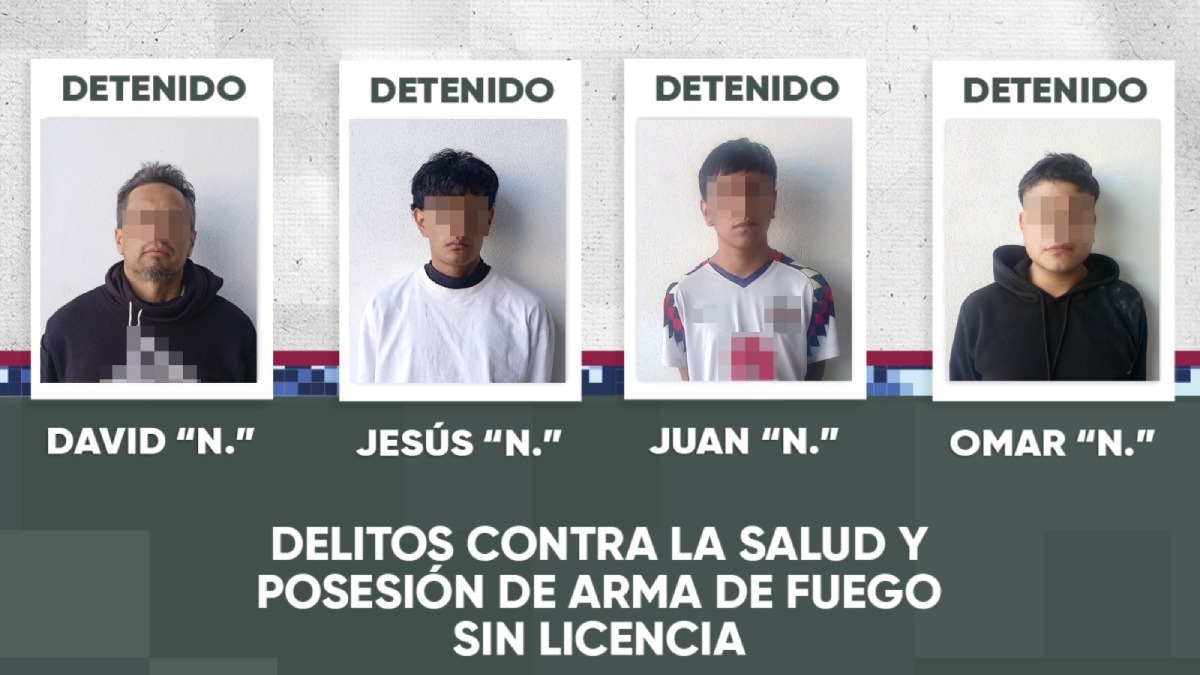 Los detenidos fueron identificados como David “N.”, de 49 años; Juan “N.”, de 21 años; Jesús “N.”, de 19 años; y Omar “N.”, de 18 años, este último con registros previos por robo a transeúnte. Durante la intervención, los elementos aseguraron un arma de fuego tipo revólver, diversas dosis de probable droga conocida como cristal y un vehículo de color negro.