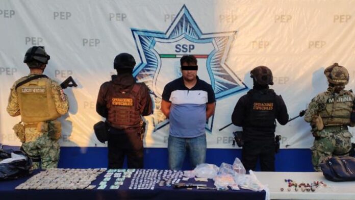 La Secretaría de Seguridad Pública de Puebla, en conjunto con la Secretaría de Marina, la Secretaría de la Defensa Nacional y la Guardia Nacional, detuvo a un hombre y aseguró más de medio kilo de posible marihuana, cerca de 270 dosis de distintos narcóticos y un arma de fuego en el municipio de Acajete.
