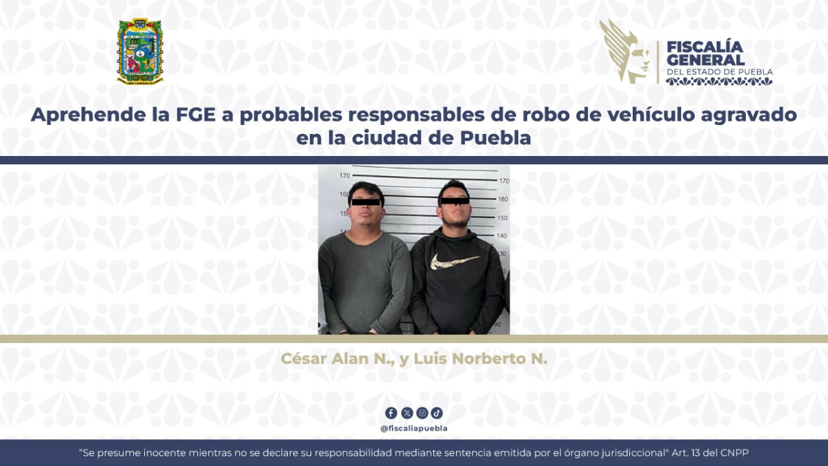 La Fiscalía General del Estado de Puebla logró identificar y detener, mediante orden de aprehensión, a César Alan N. y Luis Norberto N., señalados como presuntos responsables del delito de robo de vehículo agravado ocurrido en la ciudad de Puebla.