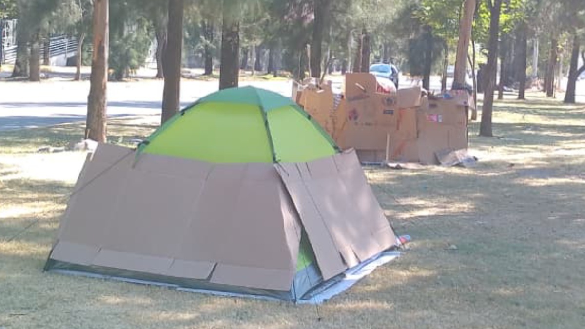 Bajo los árboles del camellón, hay tres casas de campaña más y una estructura hecha con puro cartón, se observa a personas al interior durmiendo, con varias cobijas.