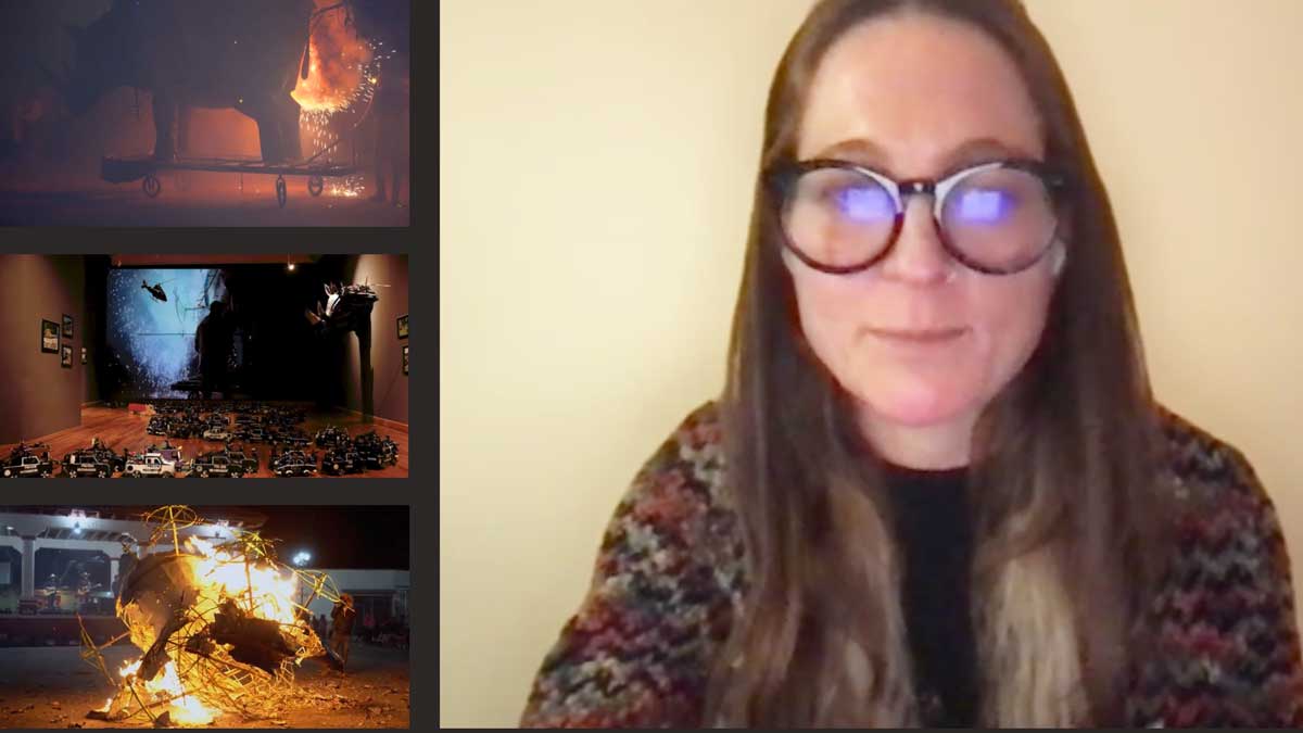 En un recorrido por varios de sus trabajos emblemáticos, los asistentes a la primera Charla con Artista del semestre, pudieron constatar cómo la práctica artística de Adela Goldbard, está nutrida de investigación de archivo y de campo, dando como resultado la combinación de escultura, video, fotografía, sonido, texto, textiles tradicionales, pirotecnia, entre otros materiales. Durante la charla, Adela Goldbard mostró las posibilidades políticas y poéticas de la destrucción y la violencia. “A partir de la puesta en escena y el trabajo colaborativo busco visibilizar la memoria social disidente y desafiar las narrativas hegemónicas, también exploro cómo la destrucción puede convertirse en ritual, declaración, metáfora, memoria y acto de resistencia al poder”, compartió.
