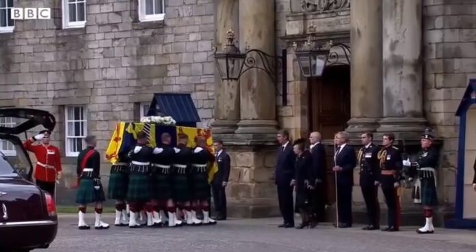 El féretro con los restos mortales de la reina Isabel II, llegó este domingo 11 de septiembre, al Palacio de Holyrood de Edimburgo, Escocia.