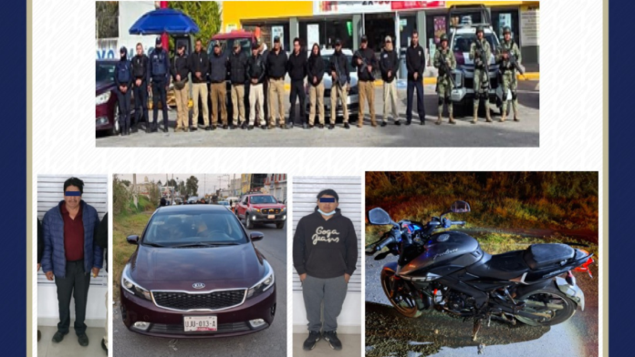 Tras instalar puntos de revisión estratégicos, fueron revisados 230 vehículos, siendo aseguradas una motocicleta Bajaj Pulsar 2024, con alteraciones en sus medios de identificación, y un vehículo Kia Forte 2018, con reporte de robo en el estado de Tlaxcala, así como los conductores de las unidades.