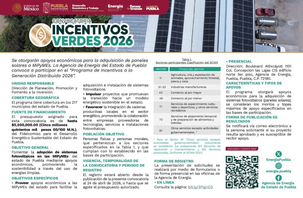 El Gobierno del Estado, a través de la Agencia de Energía del Estado de Puebla, presenta la convocatoria del programa “Incentivos Verdes 2026”, dirigida a micro, pequeñas y medianas empresas (MiPyMEs) interesadas en incorporar sistemas fotovoltaicos en sus procesos productivos.