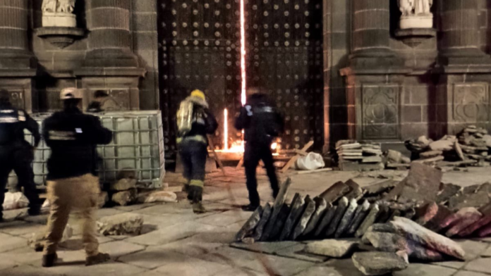 Informó que durante la madrugada del sábado 24 de enero, personal de Protección Civil estatal sofocó el incendio provocado en la puerta del recinto religioso.