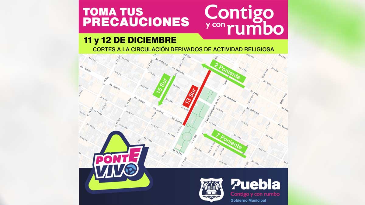 Debido a que la movilidad activa será prioridad en las inmediaciones del Templo de Nuestra Señora de Guadalupe en esos días, también se realizarán cierres viales en la calle 13 Sur, de la avenida Reforma a la avenida Juárez, por lo que se pide a la población tomar vías alternas.