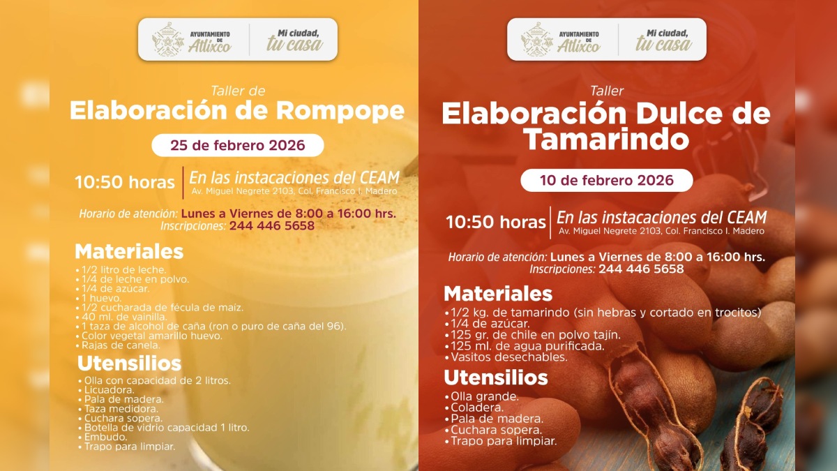 El 10 de febrero se realizará el Taller de Elaboración de Dulce de Tamarindo y el 25 de febrero el Taller de Elaboración de Rompope, además, todos los miércoles de febrero se impartirá el Taller de Educación Financiera en el Hogar, para mayores informes e inscripciones las interesadas pueden comunicarse al 244 446 56 58.