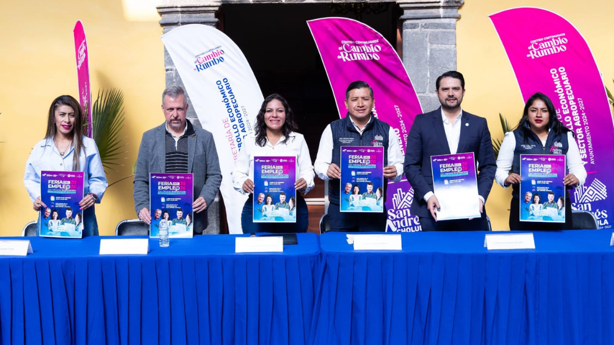 La presidenta municipal de San Andrés Cholula, Lupita Cuautle, en conjunto con los presidentes de la Cámara de Comercio, Servicios y Turismo de Puebla (CANACO), Manuel Flores Fernández y de la Cámara Nacional de la Industria de Transformación Puebla (CANACINTRA), Carlos Julián Sosa Spínola, presentó la “Feria del Empleo 2026 con Perspectiva de Género”.