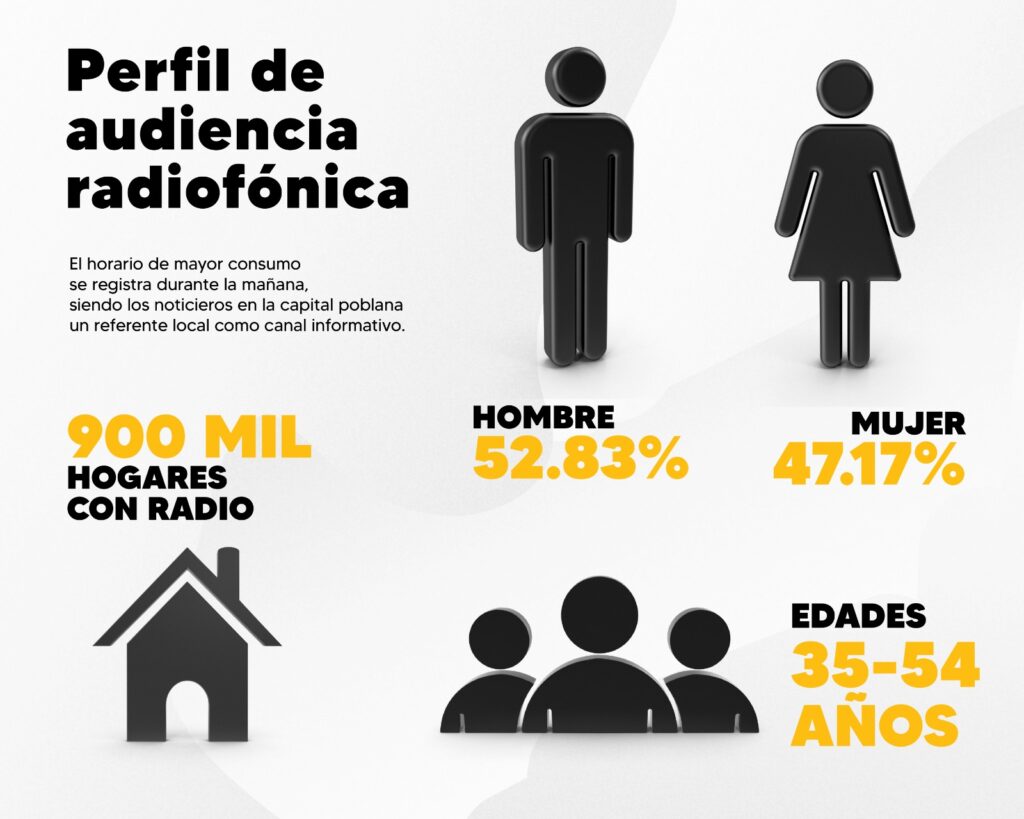 Según refieren estudios de medición de audiencia radiofónica realizados por el Instituto Federal de Telecomunicaciones, en Puebla el nivel de encendidos radiofónicos se mantiene con un perfil de audiencia equilibrado: 52.83% hombres y 47.17% mujeres, predominando el grupo de edad entre 35 y 54 años, lo que representa una preponderancia del sector poblacional en edad productiva. El horario de mayor consumo se registra durante la mañana, siendo los noticieros en la capital poblana un referente local como canal informativo.