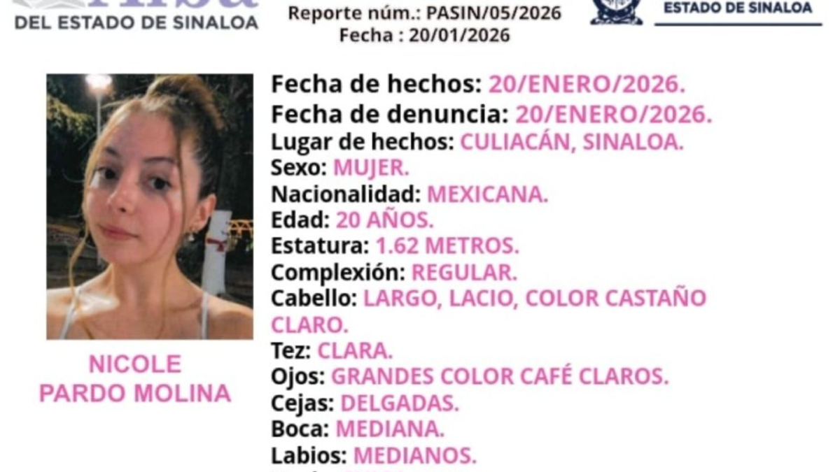 Posteriormente, la Fiscalía General del Estado de Sinaloa emitió una ficha de búsqueda a nombre de Nicole Pardo Molina, en la que se detallaba que al momento de su desaparición vestía blusa morada, pantalón negro, huaraches y un moño negro.