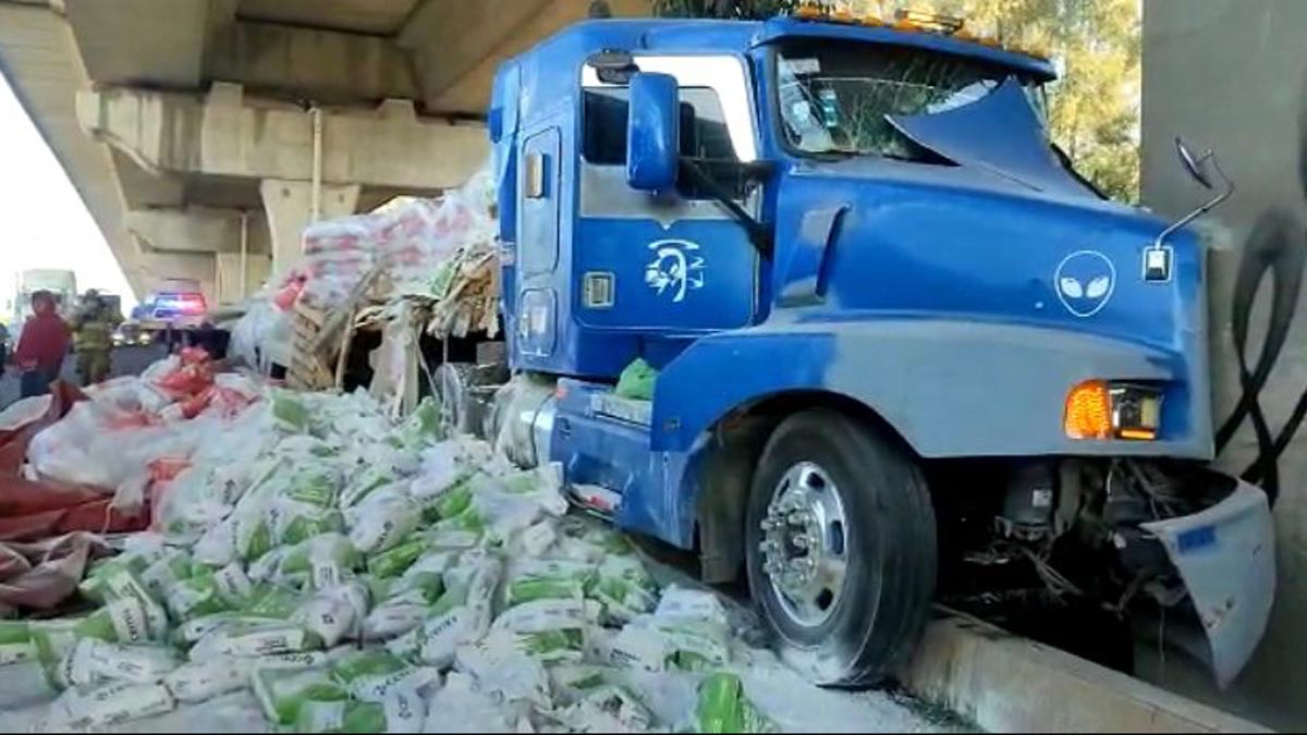 El conductor de un tractocamión de color azul, que transportaba material para construcción, perdió el control de la unidad y chocó contra uno de los soportes de concreto del segundo piso.