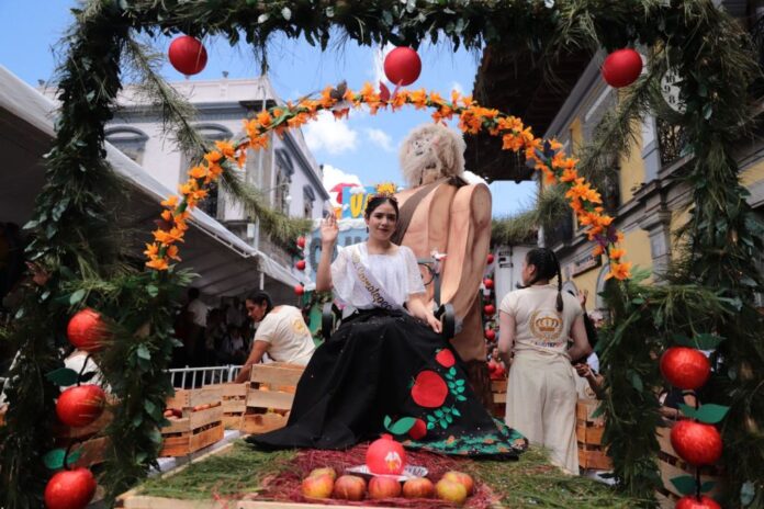 Este año desfilaron 40 carros alegóricos provenientes de juntas auxiliares, barrios, comunidades y asociaciones civiles, todos ellos repartiendo manzanas a los asistentes.