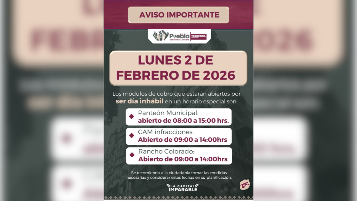 El Gobierno de la Ciudad, a través de la Tesorería Municipal, informa a la ciudadanía los módulos de cobro que estarán abiertos en un horario especial este lunes 2 de febrero, por ser día inhábil.
