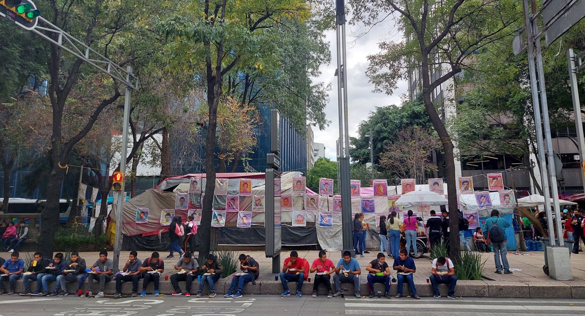 Estudiantes de la Normal Rural Carmen Serdán de Teteles, Puebla, suman 24 horas de bloqueo en Paseo de la Reforma y Avenida Insurgentes de la Ciudad de México, donde denuncian la destitución de directivos.