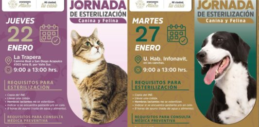 La presidenta de Atlixco, Ariadna Ayala, a través del área de Bienestar Animal, impulsa jornadas gratuitas de servicios veterinarios en distintas colonias del municipio para fomentar el cuidado responsable de las mascotas. Se ofrecerán esterilización canina y felina, consulta médica preventiva y desparasitación, de 9:00 a 13:00 horas, los días 22, 27 y 30 de … Sigue leyendo Ofrecen gratis la esterilización y desparasitación de mascotas en Atlixco