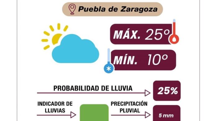 El Gobierno de la Ciudad de Puebla informó que se espera un descenso térmico moderado para las próximas horas, con temperaturas que oscilarán entre los 10°C mínimos y 25°C máximos, acompañado de cielo parcialmente nublado y vientos ligeros debido a sistemas atmosféricos que se desplazan sobre la región.