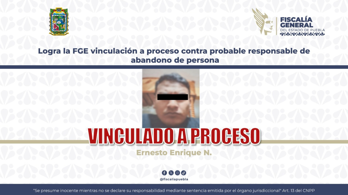La Fiscalía General del Estado logró, mediante la aportación de diversos argumentos, la vinculación a proceso de Ernesto Enrique N., por su probable responsabilidad en el delito de abandono de persona ocurrido en el municipio de Zacatlán.