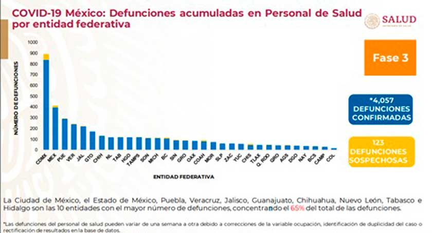 A nivel nacional se han reportado 4 mil 057 muertes de personal de Salud por coronavirus y 123 son defunciones sospechosas por dicha enfermedad.