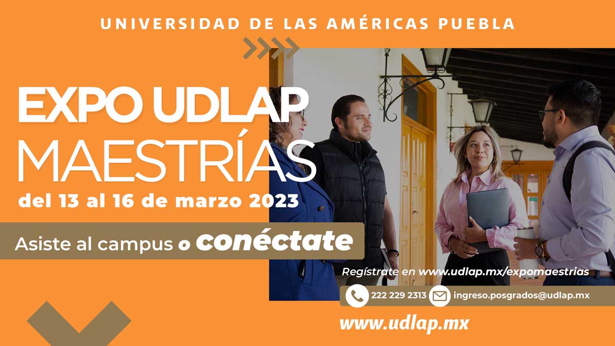 Del 13 al 16 de marzo, la Universidad de las Américas Puebla (UDLAP) lleva a cabo su Expo Maestrías, evento en el que, de manera virtual o presencial, los profesionistas interesados en estudiar una maestría, tendrán la oportunidad de escuchar información de la oferta académica de la Universidad de las Américas Puebla, proporcionada por representantes expertos en el tema de cada programa.