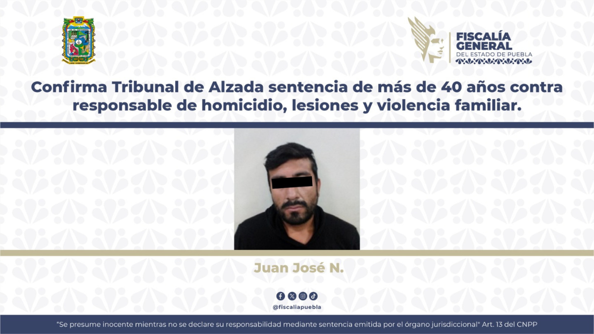 El Tribunal de Alzada confirmó la sentencia de primera instancia de 40 años de prisión en contra de Juan N., por su responsabilidad penal en la comisión de los delitos de homicidio calificado, lesiones calificadas y violencia familiar, con base en los argumentos y pruebas ofertadas por la Fiscalía General del Estado.