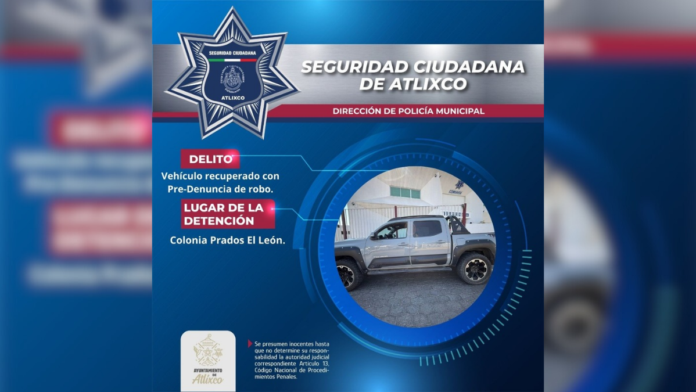 La Secretaría de Seguridad Ciudadana de Atlixco logró la recuperación de una camioneta con predenuncia de robo, la cual fue puesta a disposición de la Fiscalía General del Estado (FGE) para las investigaciones correspondientes.