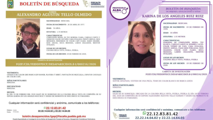 La Fiscalía General del Estado (FGE) abrió dos carpetas de investigación por el delito de desaparición de personas y activó el Protocolo Alba para la localización de Karina de los Ángeles Ruiz Ruiz y Alexandro Agustín Tello Olmedo, ambos de 50 años de edad.