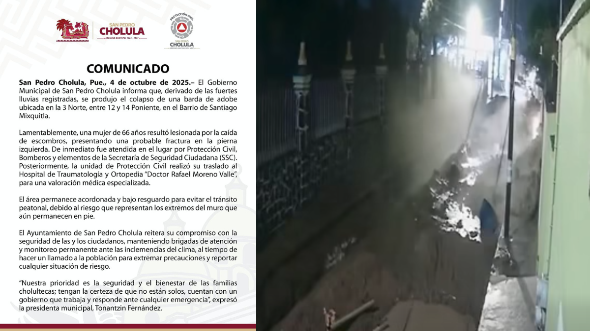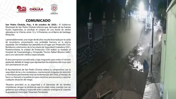 El Gobierno Municipal de San Pedro Cholula informa que, derivado de las fuertes lluvias registradas, se produjo el colapso de una barda de adobe ubicada en la 3 Norte, entre 12 y 14 Poniente, en el Barrio de Santiago Mixquitla.