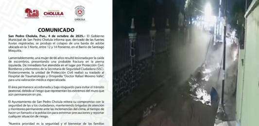 El Gobierno Municipal de San Pedro Cholula informa que, derivado de las fuertes lluvias registradas, se produjo el colapso de una barda de adobe ubicada en la 3 Norte, entre 12 y 14 Poniente, en el Barrio de Santiago Mixquitla. Lamentablemente, una mujer de 66 años resultó lesionada por la caída de escombros, presentando una … Sigue leyendo San Pedro Cholula atiende colapso de barda en Barrio de Santiago Mixquitla